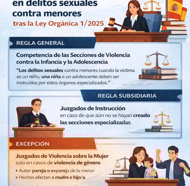 La competencia en delitos sexuales contra menores corresponde, como regla general, a las Secciones de Violencia contra la Infancia y la Adolescencia; subsidiariamente, a los juzgados de instrucción; y excepcionalmente, a los órganos de violencia sobre la mujer en supuestos de concurrencia específica.