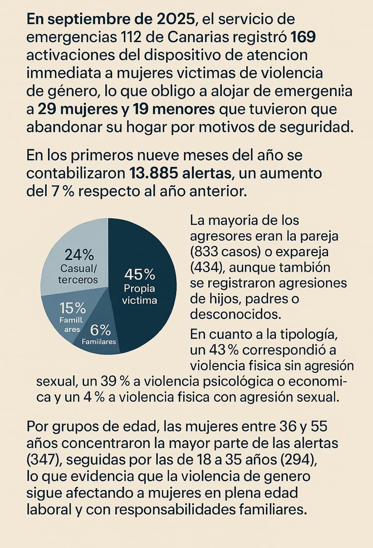 En septiembre de 2025, 29 mujeres y 19 menores en Canarias se vieron obligadas a abandonar su hogar por motivosde violencia de género y ser alojadas en régimen de emergencia. Los datos, procedentes del Instituto Canario de Igualdad y el servicio 112, reflejan la persistencia y gravedad del problema, así como la necesidad de reforzar los recursos públicos de atención y protección a las víctimas.